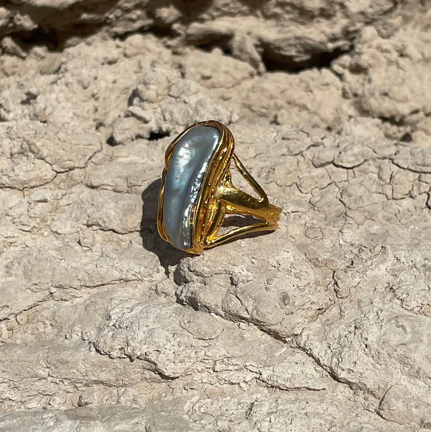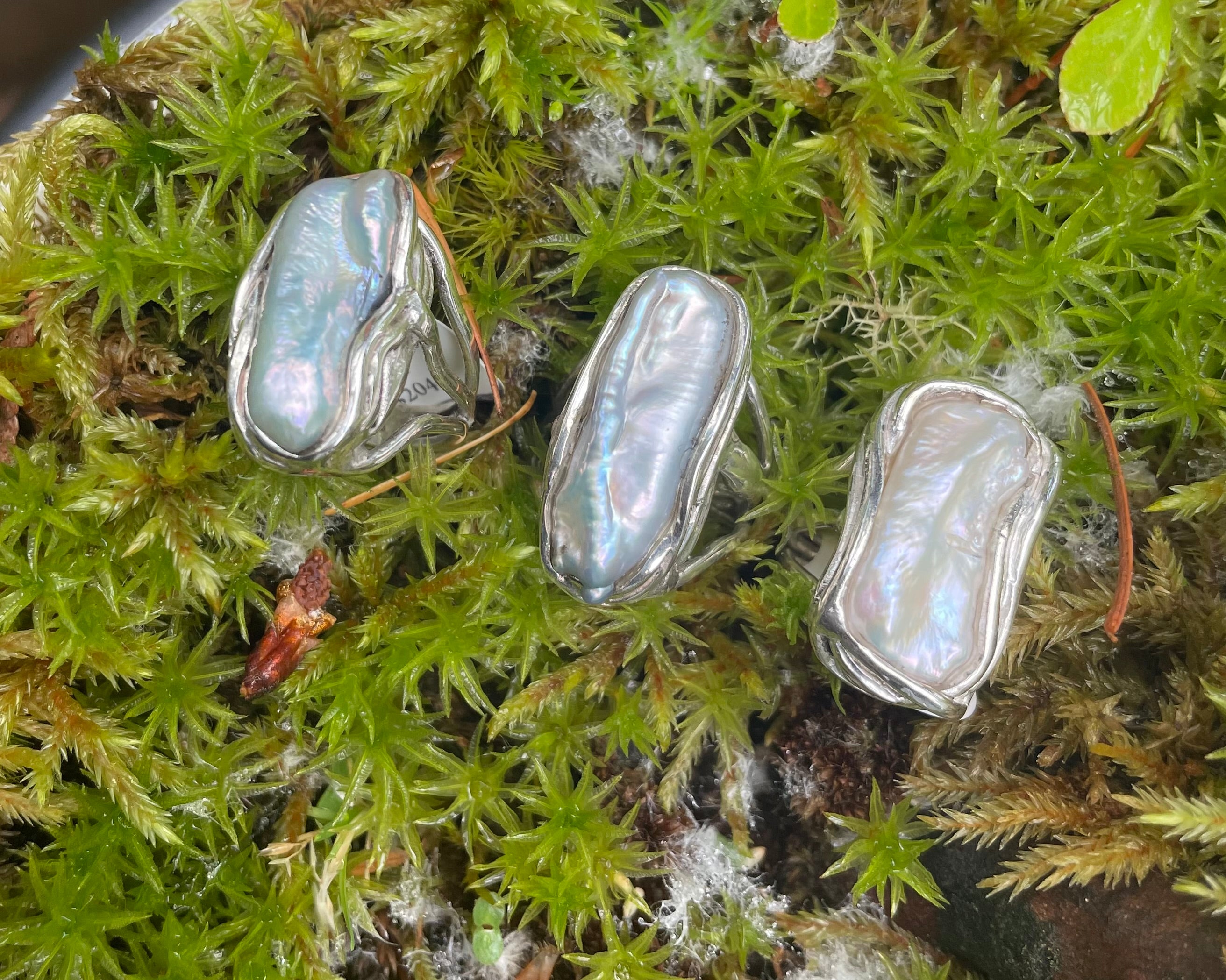 The original Biwa pearl came from Lake Biwa from Japan. Today they are produced in China with a few from select farms in Japan. The commercial term is now coined Biwa for their shape. These pearl rings are enhanced by the  one of a kind pearls. Each ring is shaped according to the pearl it holds. They come in Sterling Silver, 14k Vermeil and custom 18k. Prices will vary depending on size for the 18k rings.